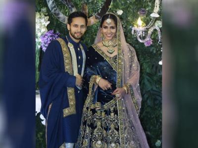 या रिसेप्शनमध्ये सायनाने इंडिगो कलरचा लहंगा घातला होता. बॉलिवूडचे सुप्रसिद्ध फॅशन डिझाईनर सब्यसाची यांनी ही लहंगा डिझाईन केला होता.