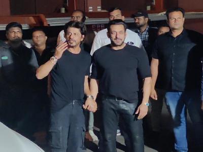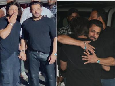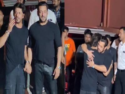 दोघांनीही काळ्या रंगाचा टीशर्ट घातला होता. जाताना दोन्ही खान यांच्यातील बॉंडिंग बघायला मिळाले. शाहरुखने आधी सलमानला मिठी मारली, फोटोग्राफर्सला पोज दिली. सलमानने गाडीचे दार उघडून शाहरुखला बाय केले.
