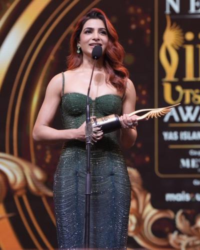 आयफा उत्सवम या अवॉर्ड शो सोहळ्यात समंथाने एक खास लूक केला. तिने स्कीन फिट हिरव्या रंगाचा ट्रान्सपरंट ड्रेस परिधान केला.