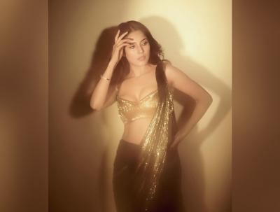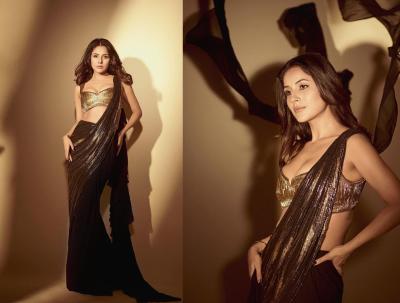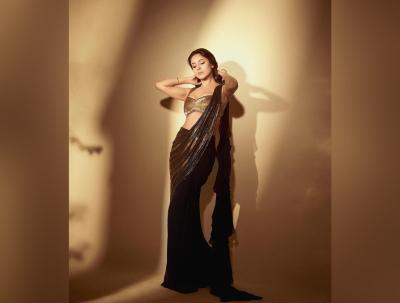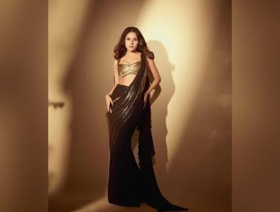 शहनाझने काळ्या रंगाची साडी नेसली, जिचा पदर सोनेरी आहे. ती या साडीमध्ये सुंदर दिसत आहे.