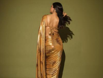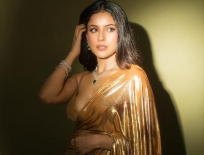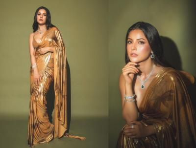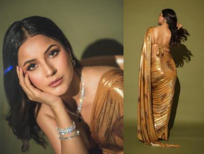 शेहनाझ हिने सोानेरी रंगाची साडी नेसली आहे. यावर तिनं बॅकलेस ब्लाउज आणि सुंदर असा नेकलेस परिधान केला आहे.