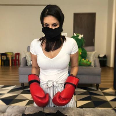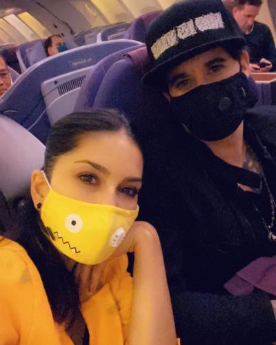सनीचे काही सोशल मीडियावरचे फोटो व्हायरल झाले आहेत. एका फोटोत सनी चक्क लहान मुलांच्या डायपरने मास्क बनवताना दिसत आहे.