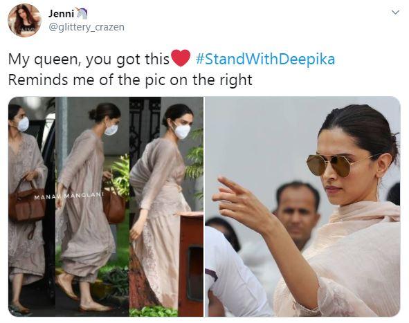 1 / 11ड्रग चॅट केसमध्ये दीपिका पादुकोणचं नाव समोर आल्यावर शनिवारी दीपिका चौकशीसाठी एनसीबीच्या ऑफिसमध्ये पोहोचली. पण त्याआधीच सोशल मीडियावर एक मोठा वर्ग दीपिकाच्या सपोर्टमध्ये समोर आला आहे. ट्विटरवर लोक #StandWithDeepika हा हॅशटॅग वापरून दीपिकाला सपोर्ट करत आहेत.2 / 11अनेक लोकांना असं वाटत आहे की, दीपिका जेएनयूच्या विद्यार्थ्यांना सपोर्ट करण्यासाठी गेली होती म्हणून तिला या ड्रग केसमध्ये ओढलं जात आहे. जेएनयूमध्ये झालेल्या हिंसेनंतर दीपिका पादुकोण प्रोटेस्ट करत असलेल्या स्टुडंट्सच्या सपोर्टमध्ये तिथे गेली होती. 3 / 11ड्रग चॅट केसमध्ये जया साहाच्या चौकशी दरम्यान काही व्हाट्सअॅप चॅट्स समोर आले होते. यातील काही चॅट हे कथितपणे दीपिका पादुकोणचे असल्याचे सांगण्यात येत आहेत. जया साहाच्या चौकशीनंतर एनसीबीने दीपिकाची मॅनेजर करिश्मा प्रकाशचीही चौकशी केली. आता दीपिकाची चौकशी केली जात आहे. 4 / 11दरम्यान, दीपिकाची चौकशी होत असताना मला तिच्यासोबत राहू देण्याची रणवीर सिंहने एनसीबीकडे विनंती केल्याची चर्चा सुरू होती. पण नंतर एनसीबीने रणवीर सिंहकडून अशाप्रकारची कोणतीही विनंती आली नसल्याचे स्पष्ट केले होते. त्यामुळे दीपिकाला एकटीलाच एनसीबीच्या प्रश्नांचा सामना करायचा आहे.5 / 116 / 117 / 118 / 119 / 1110 / 1111 / 11