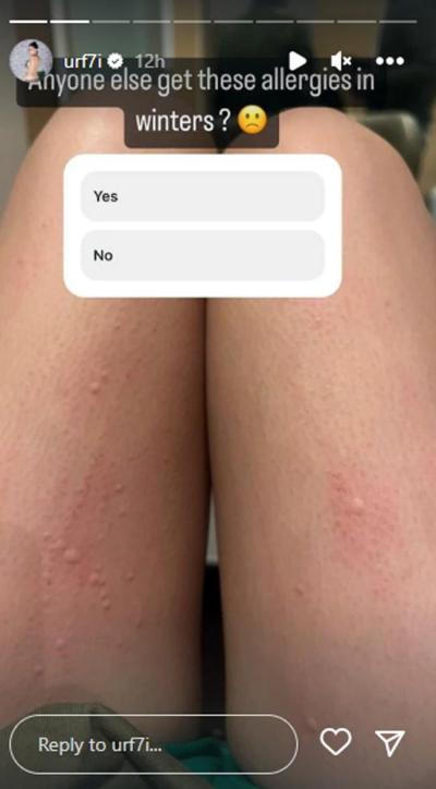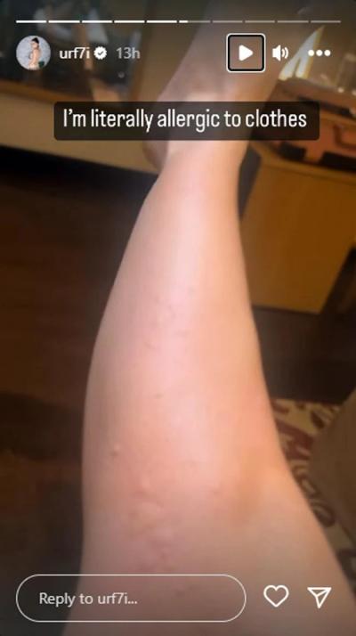 उर्फीने वुलन म्हणजेच लोकरीचे कपडे घातल्यानंतर तिच्या अंगावर रॅशेज उठले आहेत. उर्फीने दिलेल्या माहितीनुसार, "बघा, ही समस्या आहे. जेव्हा मी लोकरीचे कपडे किंवा संपूर्ण कपडे घालते तेव्हा अशा प्रकारची एलर्जी होते आणि ही एक मोठी समस्या आहे. मी पूर्ण कपडे का घालत नाही हे आता तुम्हाला कळले असेल."