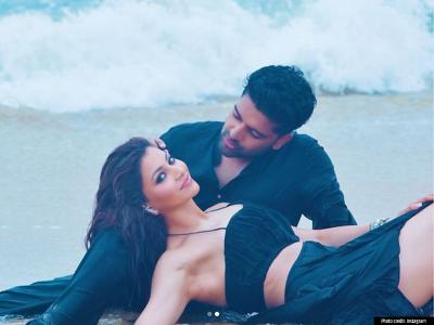 या फोटोत उर्वशी रौतेला आणि गुरू रंधावा ब्लॅक रंगाच्या आउटफिटमध्ये दिसते आहे. दोघे समुद्रकिनारी बसलेले दिसत आहेत.