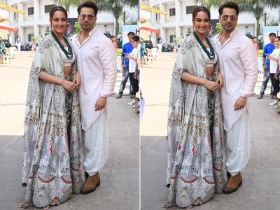 वरुण आणि सोनाक्षीने फोटोग्राफर्सना पाहाताच अशी क्यूट पोझ दिली.