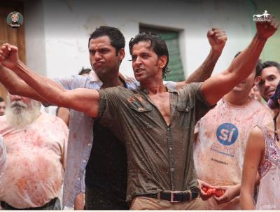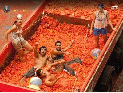 'जिंदगी ना मिलेगी दोबारा' गाजलेली टोमॅटोची होळी. हृतिक-कतरिना-अभय-फरहान आणि फरहानची सिनेमातील मैत्रिण टोमॅटोने भरलेल्या एका ट्रकमध्ये दिसत आहे