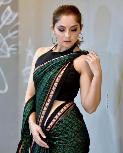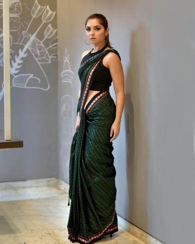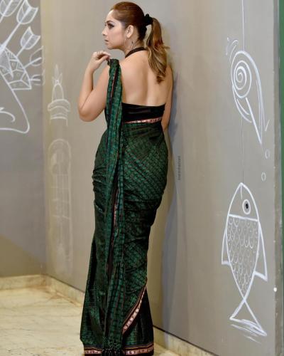 खणाच्या साडीवर सोनाली कुलकर्णीने बॅकलेस ब्लाउज घातला आहे.