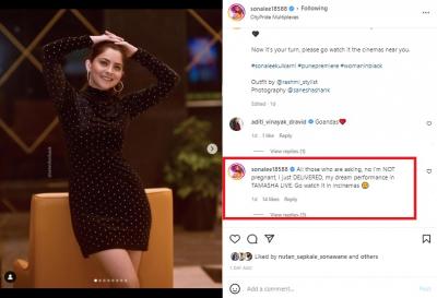 सोनाली कुलकर्णीने कमेंटमध्ये लिहिले की, जे कोणी विचारत आहे की मी प्रेग्नेंट आहे का, त्यांना सांगते की, मी प्रेग्नेंट नाही. माझा नुकताच स्वप्नातील परफॉर्मन्स तमाशा लाइव्ह भेटीला आला आहे. सिनेमागृहात जाऊन पाहा.