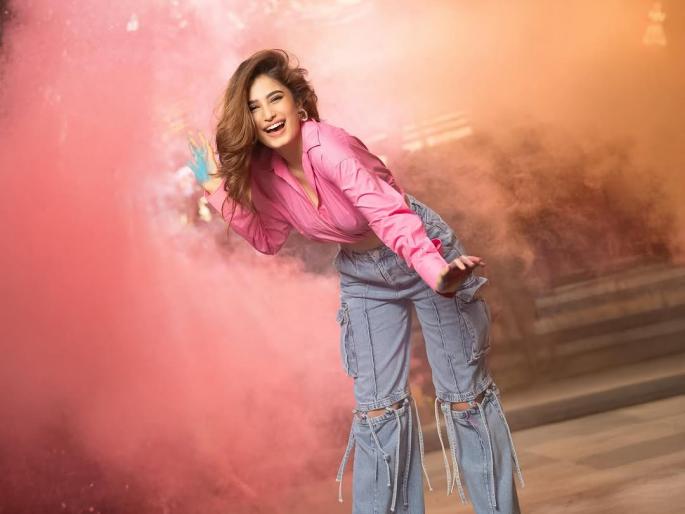 गुलाबी शर्ट, त्यावर निळ्या रंगाची जिन्स आणि हवेत उडालेला सुका रंग असं देखणं फोटोशूट तिने केलं आहे.