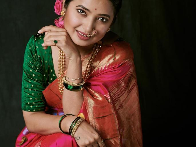 तिने साडीवर नाकात नथ, केसात गुलाबाचे फुल, हातात हिरव्या रंगाच्या बांगड्या तिने घातल्या आहेत. तसेच गळ्यात तिने मोहनमाळ घातली आहे.