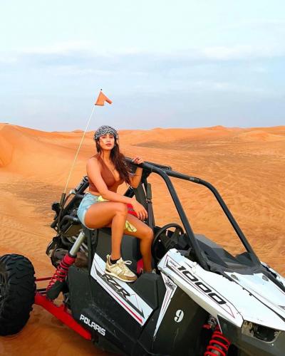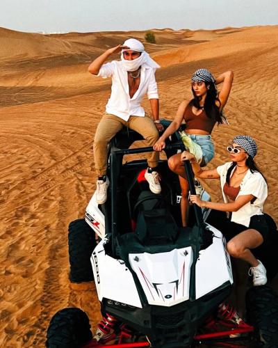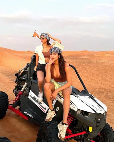 जान्हवी कपूर (Janhvi Kapoor) ने आपल्या इन्स्टाग्रामवर काही फोटो शेअर केले आहेत. या फोटोत ती तिची बहीण खुशी आणि मित्रासोब दुबईच्या वाळवंटात फिरत आहेत. जान्हवी ब्राउन टॅंक टॉप आणि शॉर्ट्स घालून डेजर्ट राइड एन्जॉय करताना दिसत आहे. खुशीने जान्हवीसारखे ब्राउन टॅंक टॉप आणि ब्लॅक शॉर्ट्स घातले आहेत. हे फोटो सोशल मीडियावर व्हायरल झाले आहेत.