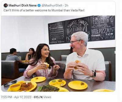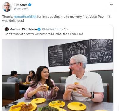 माधुरीच्या ट्विटला रिप्लाय देत, माझ्या पहिल्या वडापावच्या ट्रीटसाठी धन्यवाद माधुरी दीक्षित, चव उत्तम होती. असे टीम कुक यांनी म्हटलंय. सध्या सोशल मीडियावर या जोडीचा आणि वडापाव खातानाचा फोटो चांगलाच व्हायरल झाला आहे.