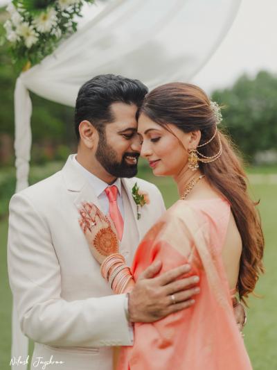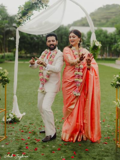 अबोली रंगाची साडी, दागदागिने, छान हेअरस्टाईल या पारंपरिक लूकमध्ये सारिका खूपच सुंदर दिसत आहे. तसंच अक्षयही सूटबूटमध्ये हँडसम दिसतोय.