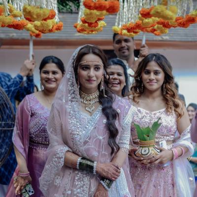 दोघांनी लग्नासाठी गुलाबी रंगाची थीम ठेवली होती. गुलाबी लेहेंगा, त्यावर साधाच मेकअप, डोईवर मुंडावळ्या, हातात हिरव्या बांगड्या, गळ्यात हार असा तिचा लूक होता. यामध्ये नवरी कमालीची सुंदर दिसत होती.
