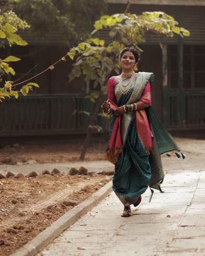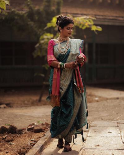 गुलाबी ब्लाऊज, हिरवा शालू, केसांचा खोपा, गळ्यात भरजरी हार, हातात पाटल्या, नथ आणि हिरव्या बांगड्या असा तिचा लूक आहे.