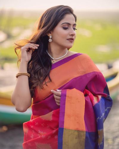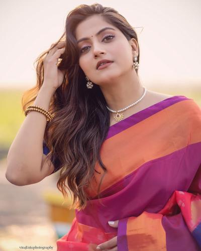नम्रता प्रधानने जांभळ्या आणि निळ्या रंगाच्या साडीत खास फोटोशूट केलंय