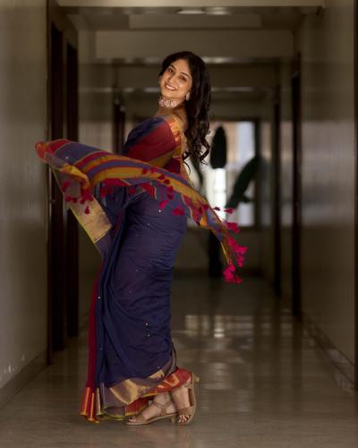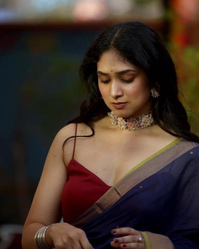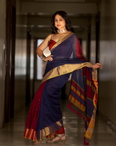 गडद लाल रंगाचा सिंगल स्ट्रॅप डीप नेक ब्लाऊज, लाल-निळी काठा पदराची साडी यात तिने शेअर केलेले हे फोटो पाहून चाहते फिदा झालेत