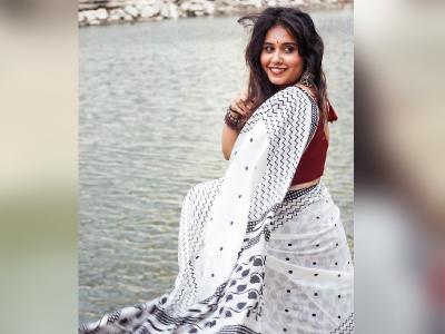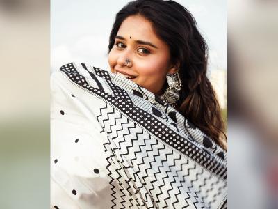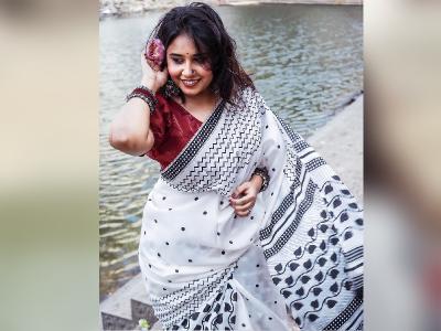 स्वानंदीने पांढऱ्या रंगाची साडी नेसली असून त्याच्यावर काळ्या रंगाने सुरेख नक्षीकाम करण्यात आलं आहे.