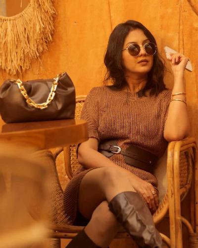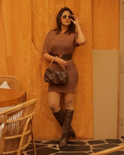 या फोटोंमध्ये तिने एक शॉर्ट वनपीस घातलाय आणि त्यावर लेदर बेल्ट आणि लेदरचे लाँग शूज असा पेहराव केलाय.