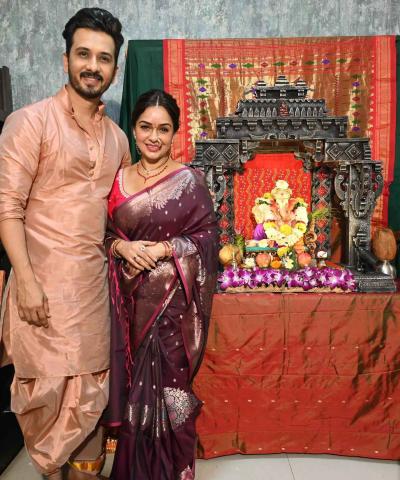 अभिजीत खांडकेकर(Abhijeet Khandkekar) आणि सुखदा (Sukhada) या गोड मराठमोळ्या जोडीनेही आपल्या लाडक्या बाप्पासोबत फोटो शेअर केला आहे. नेहमीप्रमाणेच दोघंही अगदी शोभून दिसत आहेत.