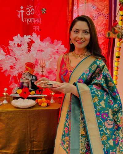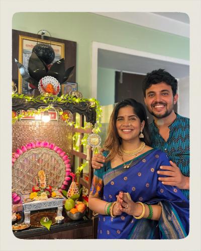 काही महिन्यांपूर्वीच लग्नबंधनात अडकलेला सर्वांची लाडकी जोडी प्रसाद जवादे (Prasad Jawade) आणि अमृता देशमुखनेही (Amruta Deshmukh) गणरायाचं स्वागत केलं आहे. निळ्या रंगाच्या साडीत अमृता खूप गोड दिसत आहे. तर प्रसादनेही मॅचिंग आऊटफिट घातला आहे.