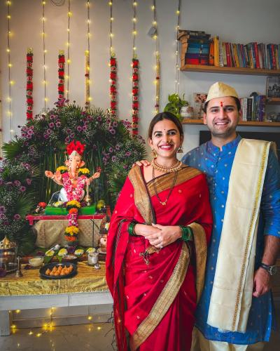 दरवर्षीप्रमाणेच यंदाही सिद्धार्थ चांदेकर (Siddharth Chandekar) आणि मिताली मयेकरच्या (Mitali Mayekar) घरी गणपती बाप्पा आला आहे.या मराठमोळ्या जोडप्याच्या वेशभूषेने खास लक्ष वेधून घेतलंय. निळ्या रंगाच्या कुर्ता पायजम्यात सिद्धार्थ उठून दिसतोय. तर लाल रंगाच्या साडीत मितालीने प्रेमातच पाडलं आहे.