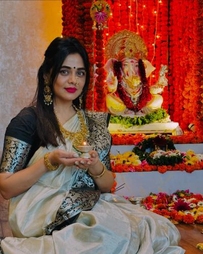 आपल्या सौंदर्यामुळे सर्वांनाच वेड लावणारी प्रार्थना (Prarthana Behere) यावर्षीही गणेशोत्सवात खुलून दिसत आहे. नथ, पारंपरिक दागिने आणि फिकट रंगाच्या साडीत ती सुरेख दिसत आहे. प्रार्थानानेही बाप्पासोबत फोटो शेअर केले आहेत.