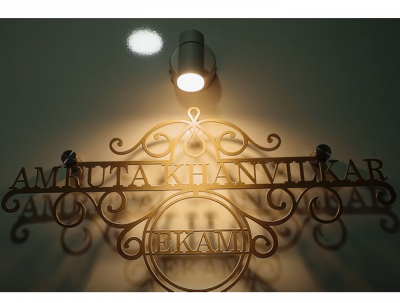 अमृतानं खास नेमप्लेट घराबाहेर लावली आहे. ज्यावर अमृता खानविलकर या नावाखाली 'एकम' असं घराचं नाव देखील लिहिण्यात आलं आहे.