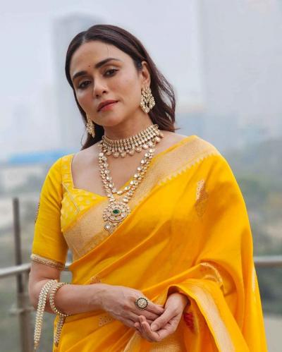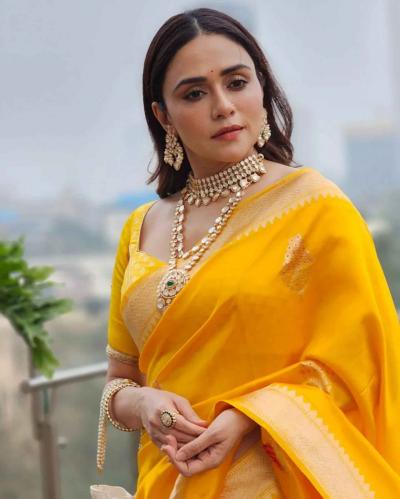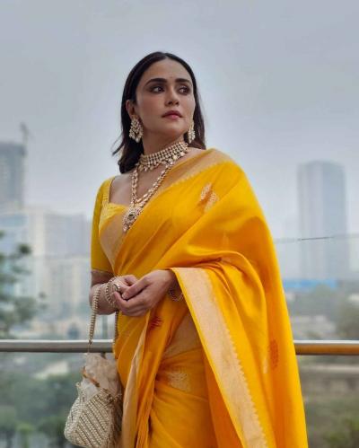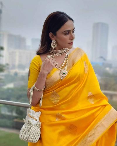 पिवळ्या साडीवर तिने घातलेले भरजरी मोत्याचे दागिनेही विशेष आकर्षण निर्माण करणारे दिसत आहेत. तिच्या गळ्यातील सुंदर हार, मॅचिंग कानातले, हातात बांगड्या, मोठी अंगठी आणि सुंदर बटवा असं तिने छान कॅरी केलेलं दिसत आहे.