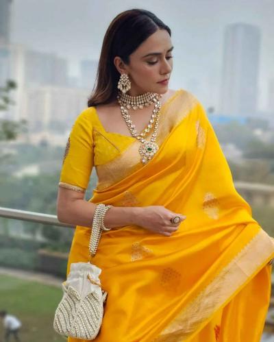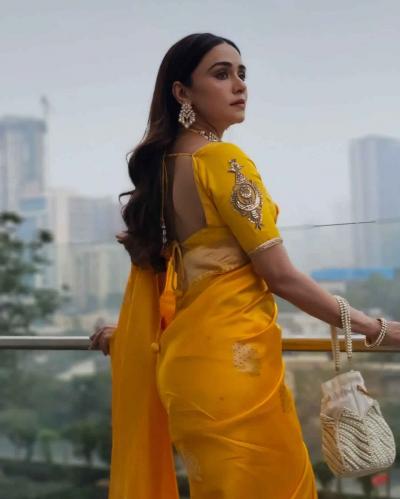 साडीचा ब्लाऊजही खूपच खास आहे. मागून डीप नेक आणि त्याच रंगाचा गोंडा बांधला आहे. खास आकर्षण म्हणजे पिवळ्या ब्लाऊजच्या स्लीव्हवर सुंदर डिझाईन आहे.