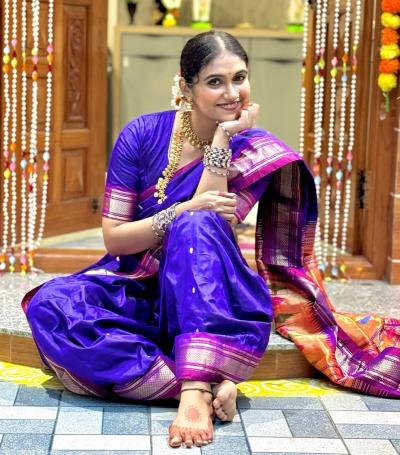 रिंकू राजगुरूने निळ्या रंगाची नऊवारी साडी नेसली आहे.