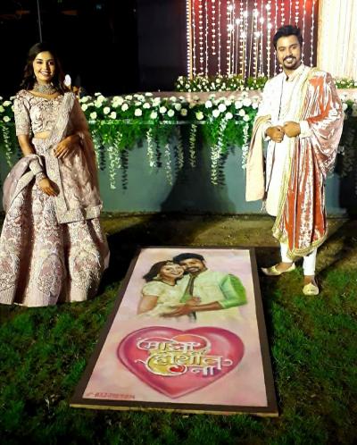 रिशेप्शनमधील ही रांगोळी सगळ्यांचं लक्ष वेधून घेत होती. या रांगोळीत शिवानी व विराजसचा फोटो व माझा होशील ना या मालिकेचं टायटल रेखाटण्यात आलं होतं.
