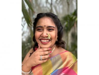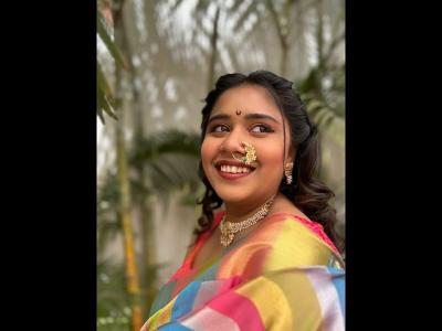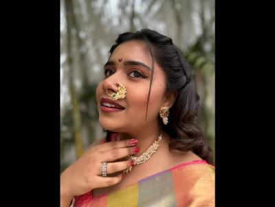 त्या साडीवर तिनं कपाळावर चंद्रकोर, नाकात नथ तसेच गळ्यात मोत्याचा हार, असे साजेसे दागिने घातल्याचे पाहायला मिळत आहेत.