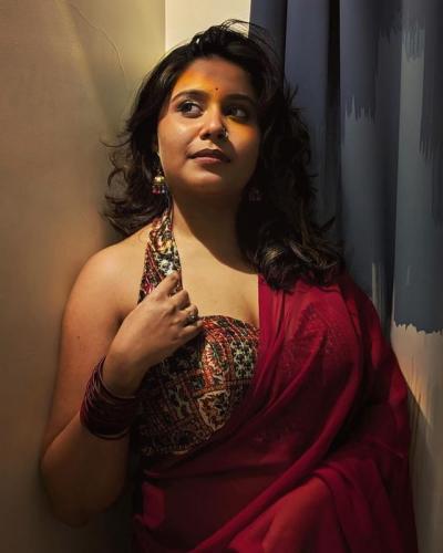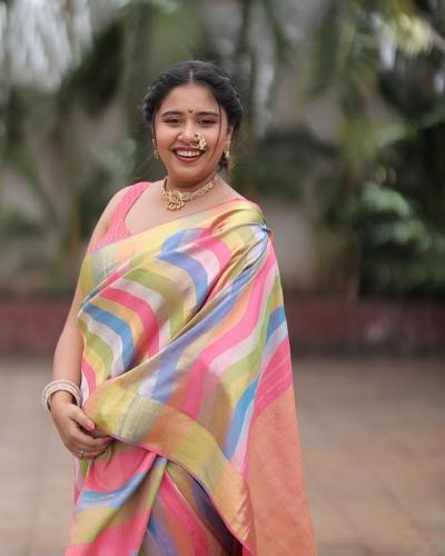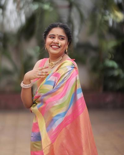 वेगवेगळ्या रंगाचं कॉम्बिनेशन असलेली स्ट्राईप साडी तसेच त्यावर ऑफ शोल्डर ब्लाऊज परिधान करून स्वानंदीने चाहत्यांना घायाळ केलं आहे.