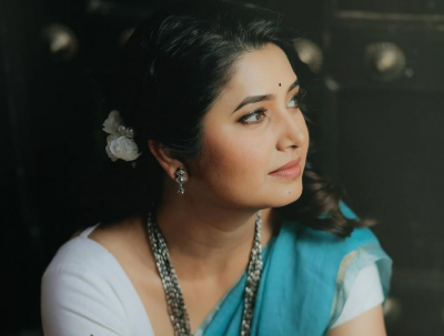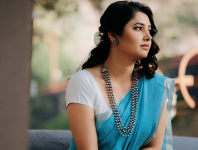 आकाशी रंगाच्या साडीवर प्राजक्ताने पांढऱ्या रंगाचा ब्लाऊज परिधान केला आहे.