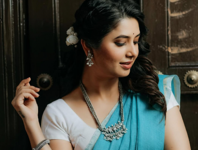 सुंदर अशा साडीवर प्राजक्तानं ऑक्सडाईज ज्वेलरी (oxidized jewelry) परिधान केली आहे