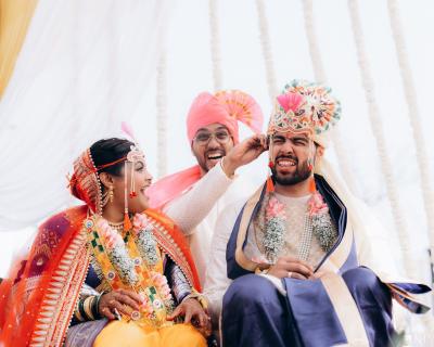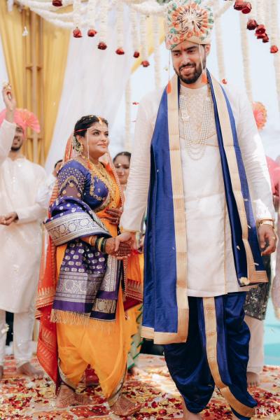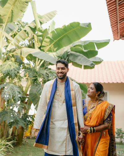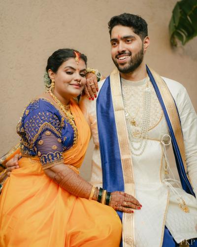 तेजश्री जाधवने लग्नात नारंगी रंगाची साडी नेसली होती. तिच्या नवऱ्याने बेज रंगाचा कुर्ता पायजमा घातला होता.