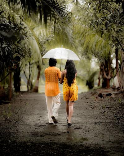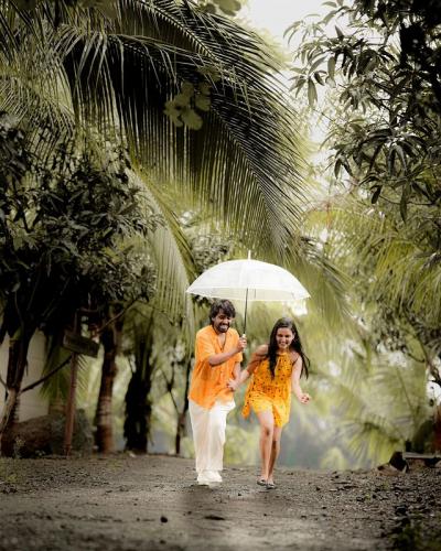 आजुबाजूला आंबा नारळाची बाग तसेच मनमोहक वातावरणात हे जोडपं पावसात भिजण्यात आनंद लूटताना दिसत आहे.