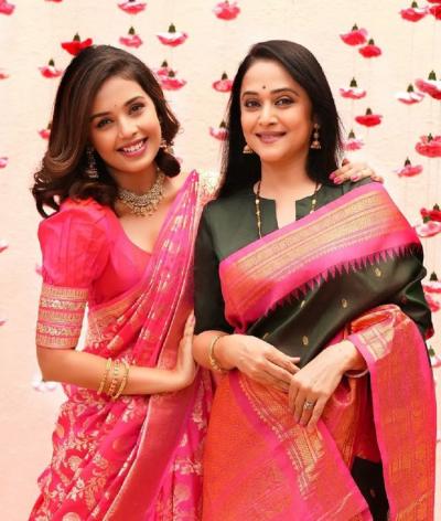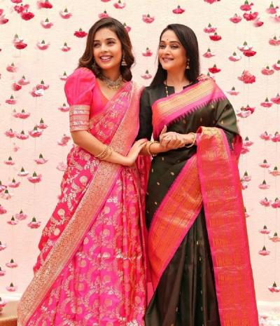 या फोटोत शिवानी पिंक कलरच्या साडीत आहे तर मृणाल यांनी काळ्या रंगाची पिंक बॉर्डर असलेली साडी नेसली आहे.