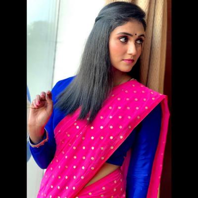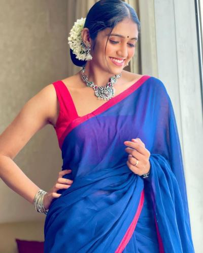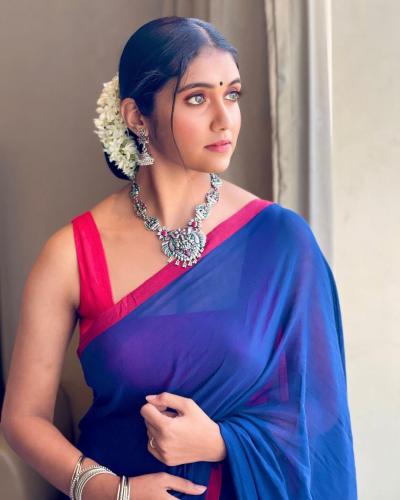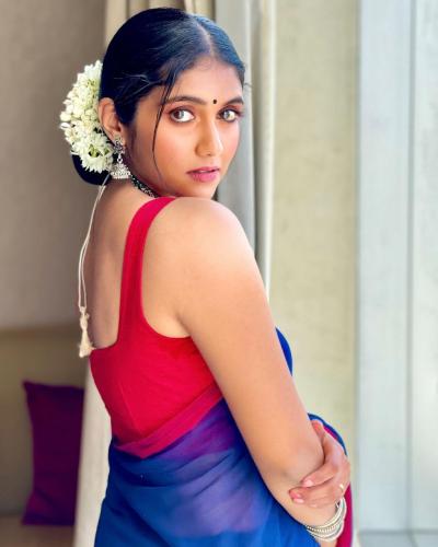 रिंकूने निळ्या रंगाच्या साडीवर लाल स्लिवलेज ब्लाउज आणि केसात गजरा, गळ्यात नेकलेस घातलेला दिसतो आहे.