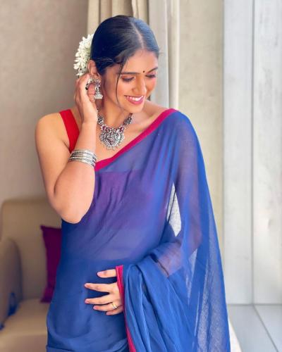या फोटोत रिंकू राजगुरू निळ्या रंगाच्या साडीत दिसते आहे.