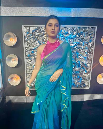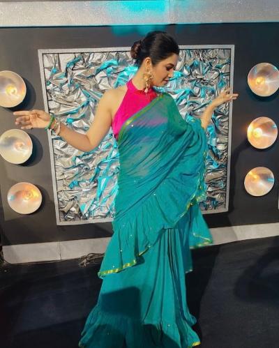 आकाशी रंगाच्या साडीत तिने सेटवरील काही फोटो पोस्ट केलेत. यात ती कमालीची सुंदर दिसत आहे. त्यावर तिने स्लीव्हलेस गुलाबी ब्लाऊज परिधान केला आहे.