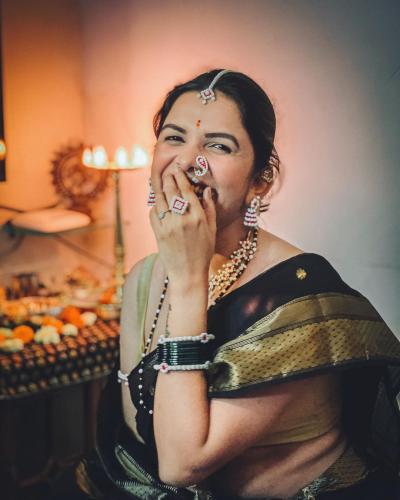 मिताली मयेकर हिने काळ्या रंगाच्या साडीवर हलव्याचे दागिने परिधान केले आहेत.