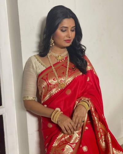 प्राजक्ता माळीने लाल रंगाच्या साडीतले फोटो शेअर करत लिहिले की, यह लाल इश्क, यह मलाल इश्क