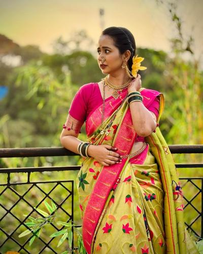 केसात चाफा, नाकात नथ तसेच पिस्ता रंगाची साडी परिधान करून गौरीने हे नवं फोटोशूट केलंय.