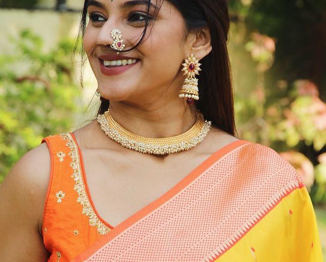 पिवळ्या रंगाची पैठणी त्यावर साजेसे मोत्यांचे दागिने अशा पेहरावात अभिनेत्री पाहायला मिळते आहे.