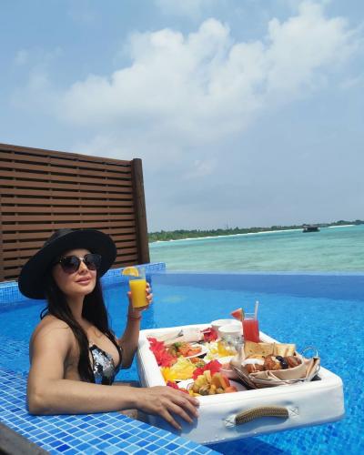 या फोटोत मिनिषा पूलमध्ये ब्रेकफास्ट करताना दिसते आहे. (फोटो: इंस्टाग्राम)