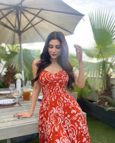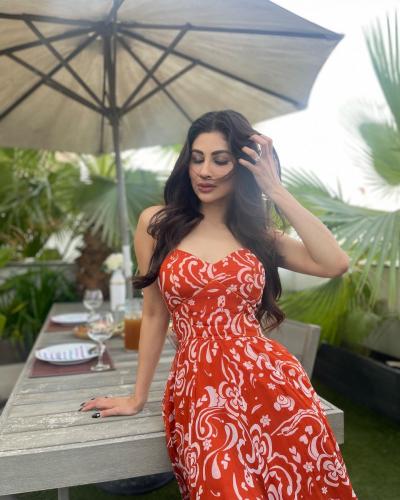 रेड प्रिंटेड कलरच्या आउटफिटमध्ये मौनी रॉय खूपच हॉट लूकमध्ये दिसत आहे. (फोटो: इंस्टाग्राम)