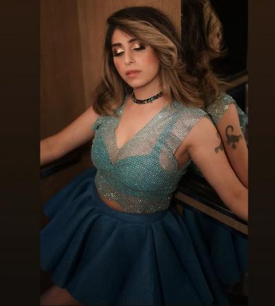 या फोटोंमध्ये नेहा भसीन ब्ल्यू कलरचा शॉर्ट स्कर्ट घातलेला दिसत आहे. (फोटो: इंस्टाग्राम)